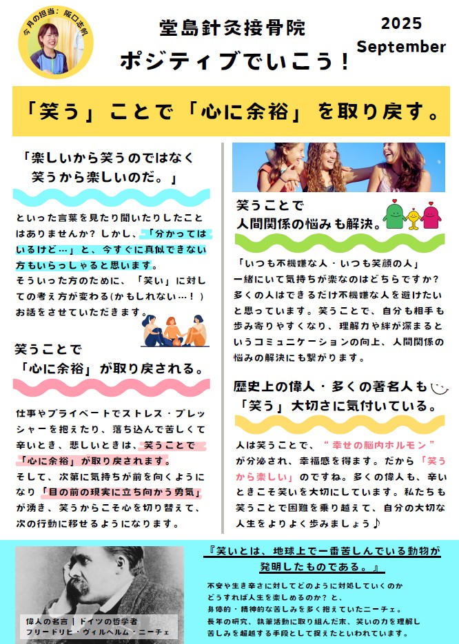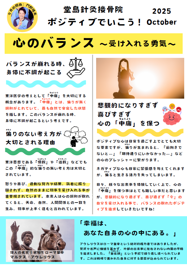 月刊 堂島だより ホーム 当院について 月刊 堂島だより 「ポジティブでいこう!」記事一覧 心のバランス~受け入れる勇気~ 記事を読む 「笑う」ことで「心に余裕」を取り戻す 記事を読む 「歳をとる」ということ 記事を読む 運動をして元気になろう! 記事を読む ポジティブスパイラルに飛び込もう! 記事を読む 自分に優しくなれる方法 記事を読む 考え方を変える 記事を読む 身体を動かすと元気になる!! 記事を読む 思考と脳内ホルモンのバランス 記事を読む 「不安」という感情について。 記事を読む 「堂島ヘルスケア通信」記事一覧 体内時計 記事を読む これからの季節に気を付けたい 風邪 記事を読む アレルギー性の花粉症、鼻炎症について 記事を読む お灸でセルフケア 記事を読む 不安と感謝 記事を読む 「梅雨」と「東洋医学」 記事を読む ストレスってなんだろう? 記事を読む 【陰】と【陽】 記事を読む 身体を温める大切さ 記事を読む 春の身体と野菜 記事を読む 健康って一体なんだろう? 記事を読む