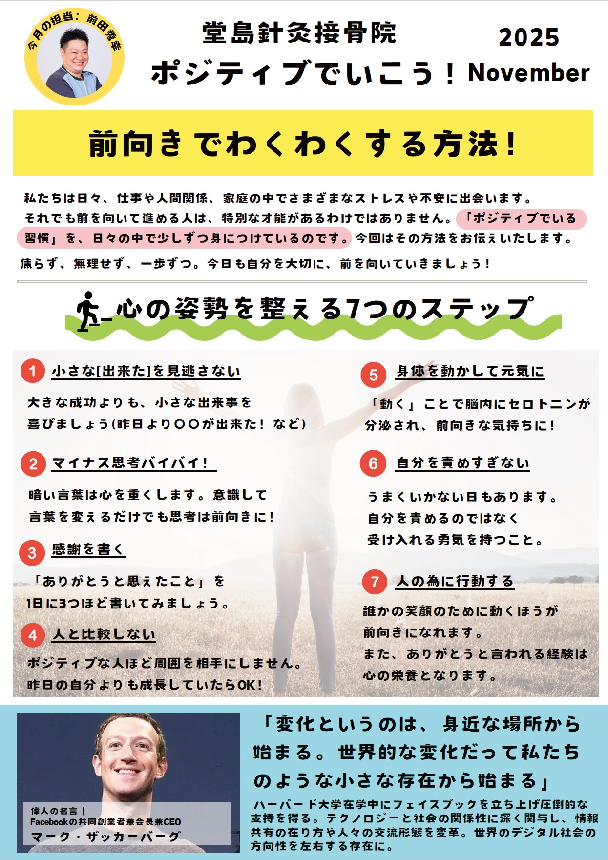 月刊 堂島だより ホーム 当院について 月刊 堂島だより 「ポジティブでいこう!」記事一覧 前向きでわくわくする方法! 記事を読む 心のバランス~受け入れる勇気~ 記事を読む 「笑う」ことで「心に余裕」を取り戻す 記事を読む 「歳をとる」ということ 記事を読む 運動をして元気になろう! 記事を読む ポジティブスパイラルに飛び込もう! 記事を読む 自分に優しくなれる方法 記事を読む 考え方を変える 記事を読む 身体を動かすと元気になる!! 記事を読む 思考と脳内ホルモンのバランス 記事を読む 「不安」という感情について。 記事を読む 「堂島ヘルスケア通信」記事一覧 体内時計 記事を読む これからの季節に気を付けたい 風邪 記事を読む アレルギー性の花粉症、鼻炎症について 記事を読む お灸でセルフケア 記事を読む 不安と感謝 記事を読む 「梅雨」と「東洋医学」 記事を読む ストレスってなんだろう? 記事を読む 【陰】と【陽】 記事を読む 身体を温める大切さ 記事を読む 春の身体と野菜 記事を読む 健康って一体なんだろう? 記事を読む