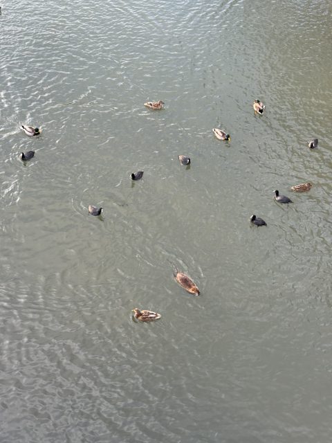 大川の橋を渡っていると、いつもは静かな川の中に、たくさんの鳥たちが泳いでいました。